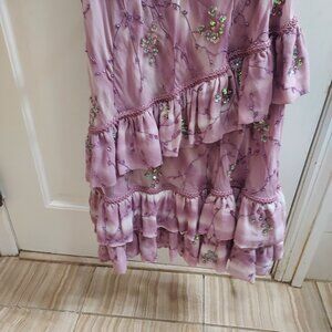 Other details: Fixed shoulder straps. Floral embroidery with sequin embellishments. Tiered ruffles. V neck. Sleeveless. Hook-and-eye and hidden zip at side. Shell: 100% silk. Lined. Dry clean.