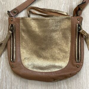 Leather crossbody by TANO. Front has two zipper pockets. Zip top with two interior pockets and one interior zip pocket