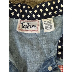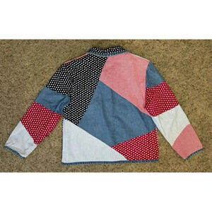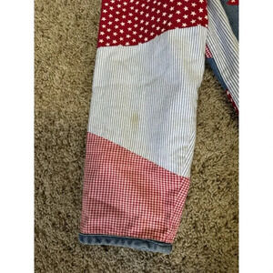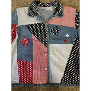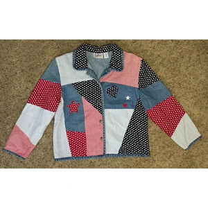 TANTRUMS Women's Denim Jean Jacket Patriotic Patchwork USA Flag Red Blue MEDIUM
