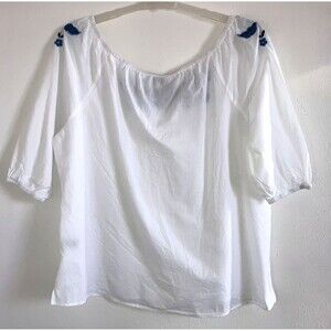 TANTRUMS XXL 1X White 100% Cotton Blue Embroidered Peasant Top 3/4 Puff Sleeve