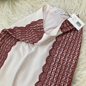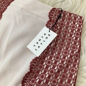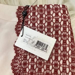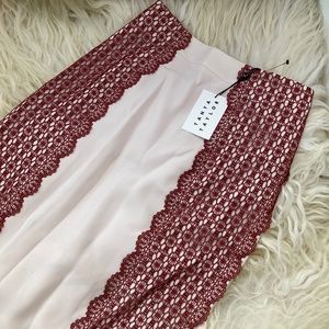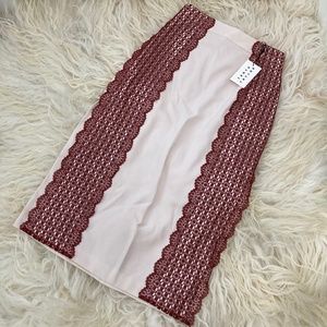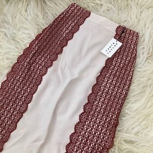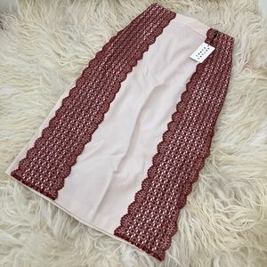 Pink and maroon Tanya Taylor midi Simmons skirt with dual crocheted panels at sides and concealed zip closure at center back.