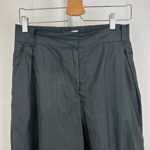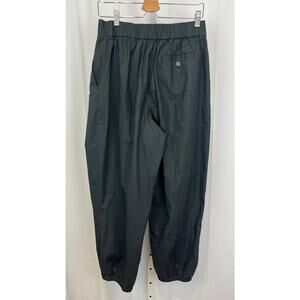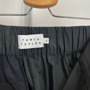 Dionne Pants from Tanya Taylor. Zip fly, button closure, pleated front, partial elastic waist, high rise, gentle balloon leg with elastic hem. Lightweight cotton poplin in black. Womens 8. There is some subtle fading / discoloration on the front hip/leg - see photos. Otherwise terrific preowned condition. Waist flat: 14.5" Front rise: 13" Inseam: 27.5"