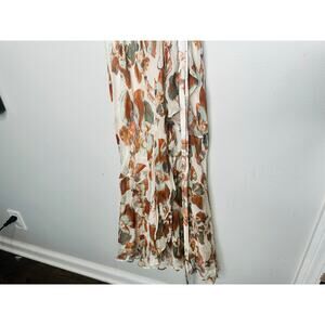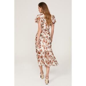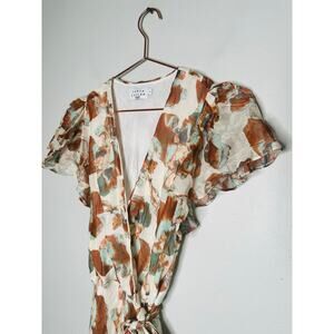 TANYA TAYLOR Floral Brown White Wrap Ruffle Sleeves Floral Blaire Dress in size 4 is a feminine and elegant dress that effortlessly combines sophistication with a touch of bohemian charm. The wrap-style design flatters the figure, accentuating the waist with its self-tie belt. Its beautiful brown and white floral print adds a vintage-inspired flair, while the ruffle sleeves enhance the dress’s delicate, romantic vibe. Made from a lightweight fabric, the dress is perfect for both casual and semi-formal occasions. Pair it with strappy sandals or heels for an effortlessly chic look, ideal for spring or summer events.