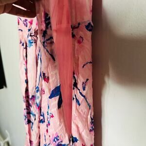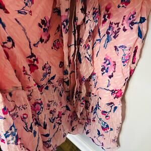 TANYA TAYLOR Pink Floral Silk Wrap Short Sleeve Ruffle V-Neck Midi Dress Size 20. This style features a surplice bodice that wraps around the body and ties at the waist, creating a flattering silhouette for most body types. The dress reaches the mid-calf, offering a versatile length suitable for various occasions. The sleeves are short and fluttery, adding a touch of femininity and lightness.