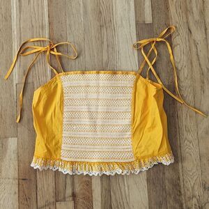 Smocked cropped top with sweet tie straps and a ruffle trim.