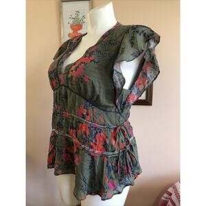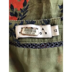 TANYA TAYLOR Ruffle Sleeve Green Red Floral Lined 100% Silk Size 12 V Neck