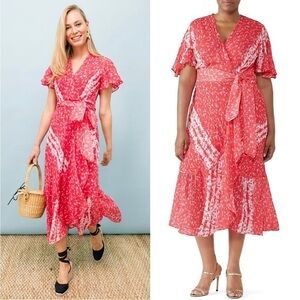 Tanya Taylor New Blaire Dress Ditsy Floral Stripe Guava A breezy wrap dress with bright floral print featuring flutter sleeves and a self-tie waist to add feminine flair to this fan-favorite.