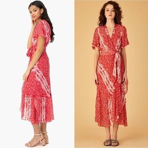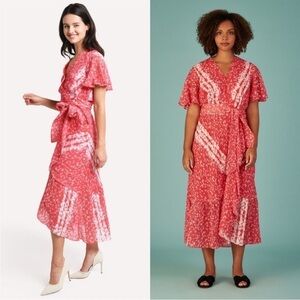 TANYA TAYLOR Silk Ruffle Floral Stripe Flutter Short Sleeve Wrap Midi Dress 14