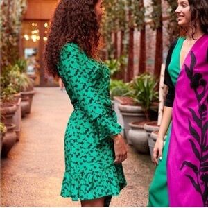 TANYA TAYLOR Wrap Dress Green Silk Leopard Print Ruffle Trim 3/4 Long Sleeves 4