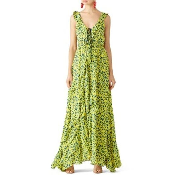 TANYA TAYLOR Yellow Blue Printed Silk Chiffon V-Neckline Maxi Dress Size 2