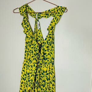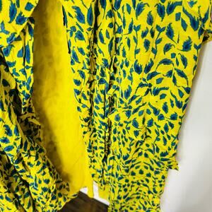 TANYA TAYLOR Yellow Blue Printed Silk Chiffon V-Neckline Maxi Dress Size 2. This dress sounds like a luxurious and elegant piece, perfect for a summer wedding, formal event, or a special occasion. This elongates the neck and adds a touch of sophistication. The flowing chiffon and v-neckline will flatter most figures, and the yellow and blue print adds a touch of whimsy and color.