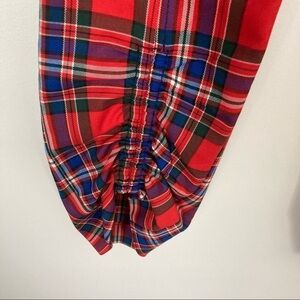 TANYA TAYLOR x REVOLVE Carrington Plaid Pants. Genuine leather waist and ruched leg openings that cater to the contemporary, these carnelian-hued bottoms are a redefined vision of British punk rock. Double side seam pockets with lustrous zipper closures. Hidden side zipper closure. Leather contrast waist. Side seam pockets with hidden zipper closures.