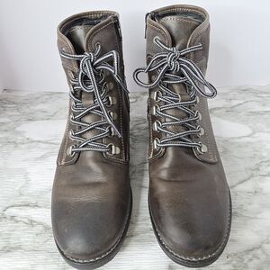 Taos Ringer brown leather lace-up combat boots, women’s size 5.5. Features a distressed leather finish with sturdy lace-up design. Perfect for grunge, edgy, and casual streetwear styles.