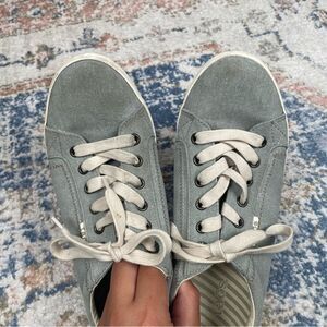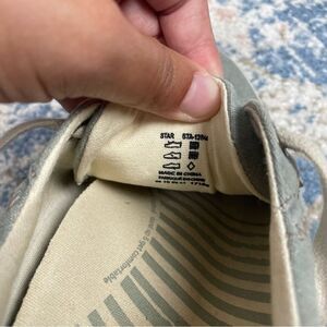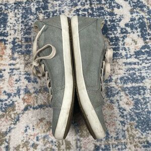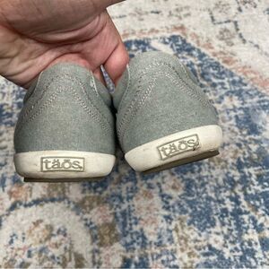 These Taos star sneakers are in good used condition. Some light dirt throughout. Could benefit from some cleaning, but also could be worn as is. Women’s size 10. Light blue canvas material.