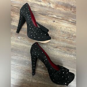 TARA SUBKOFF x BEBE Collab Swarovski Crystal & Bow Platform Peep Toe Stilettos Size 8. Leather sole. Vintage. Perfect for a night out or party! Has wear to the bottoms. Slight fading of the black near the back ankle area. 4 inch heel. In good used condition. Ask me anything!