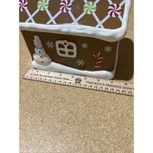 Ceramic/stoneware-style bank with peppermint roof design, snowman, candy canes, and slot on top. Rubber stopper on bottom included.