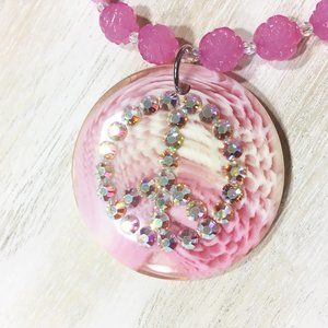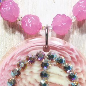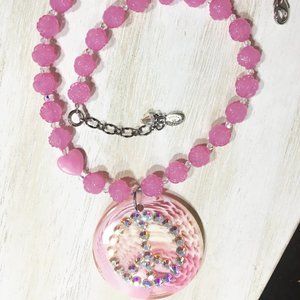 TARINA TARANTINO BABY PINK CRYSTAL LUCITE "PEACE" PENDANT & ROSE BEADED NECKLACE