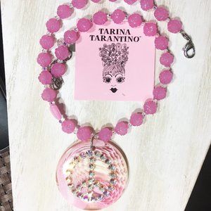 This is a TARINA TARANTINO BABY PINK CRYSTAL LUCITE "PEACE" PENDANT AND ROSE BEADED CRYSTAL, PUFFY HEART PINK & BLACK STATEMENT NECKLACE 16" (+2” ADDITIONAL CHAIN EXTENDER) 18” TOTAL LENGTH. GUARANTEED AUTHENTIC WITH SIGNATURE DESIGNER METAL STAMPED TAG (SEE PICTURES FOR DETAILS)