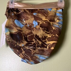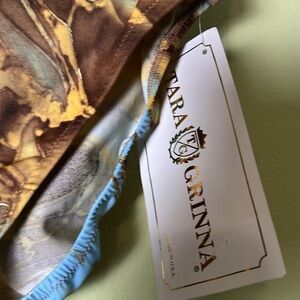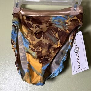 TARA GRINNA Stylish bikini bottom with a brown and blue floral pattern. Perfect for beach days.