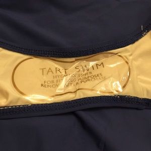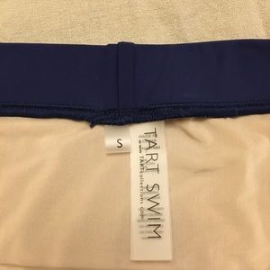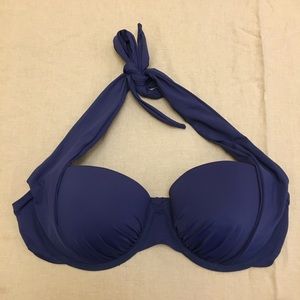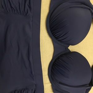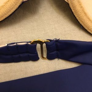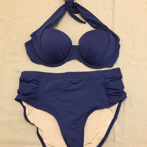 This beautiful navy blue two piece is high waisted and has a ruffle detail. The top is bra like in the cups with full coverage. This is brand new, never worn and never tried on. This came straight from the manufacturer, but has no tags.