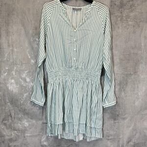 TART Collections Women's Green Stripe Sheila Smocked Waist Long Sleeve V-Neck Mini Dress SZ M