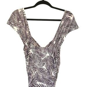 TART Size S Palm Leaf Print Ruched Bodycon Dress Stretch Navy White V-Neck
