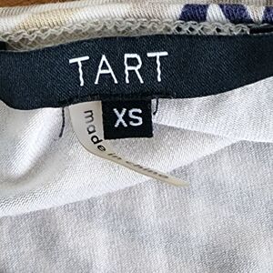 Tart women's dress. Size XS. Cold Shoulder. Rusched detail. Aztec design. Tan and navy blue. 95% modal. 5% spandex. Like new. No tears or stains.