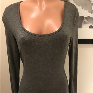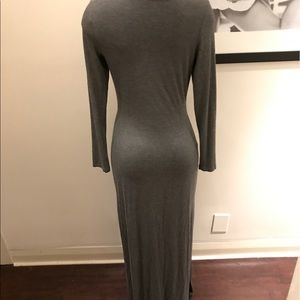 TART| medium| solid grey color, very soft & so easy to wear, sexy & slimming|scoop neck, long sleeved, long (I am 5'10 & it nearly hits the ground-perfect fit l| I’ve worn this twice, I spilled something on it (see photo) so there is s little stain from grease or something|otherwise it looks and feels amazing on