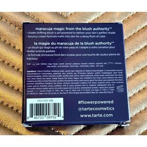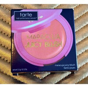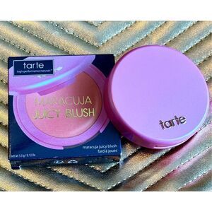 Tarte Maracuja Juicy Blush in Rose is a full sized mirrored blush compact at .12 ounce. It's a cream blush with a hydrating and long-lasting formula. Formulated with maracuja passionfruit and hyaluronic acid, it provides juicy, vibrant color while also hydrating and plumping the skin. And ultra-creamy, buildable and blendable blush that glides on like silk, melting into the complexion for a natural, second skin flush. It's vegan, gluten-free and cruelty free. It's pH powered, shifting with your natural pH levels and creating your perfect shade. Maracuja passionfruit drenches your skin in a 12-hour juicy color. Brightening mineral pigments enhance your natural glow. This is dermatologist tested and it's NWT!