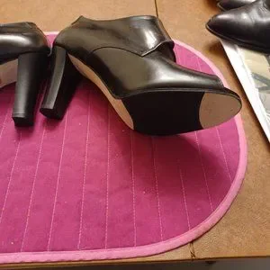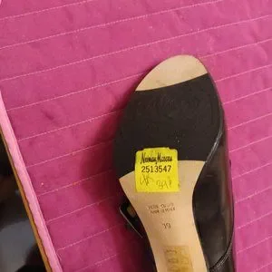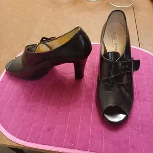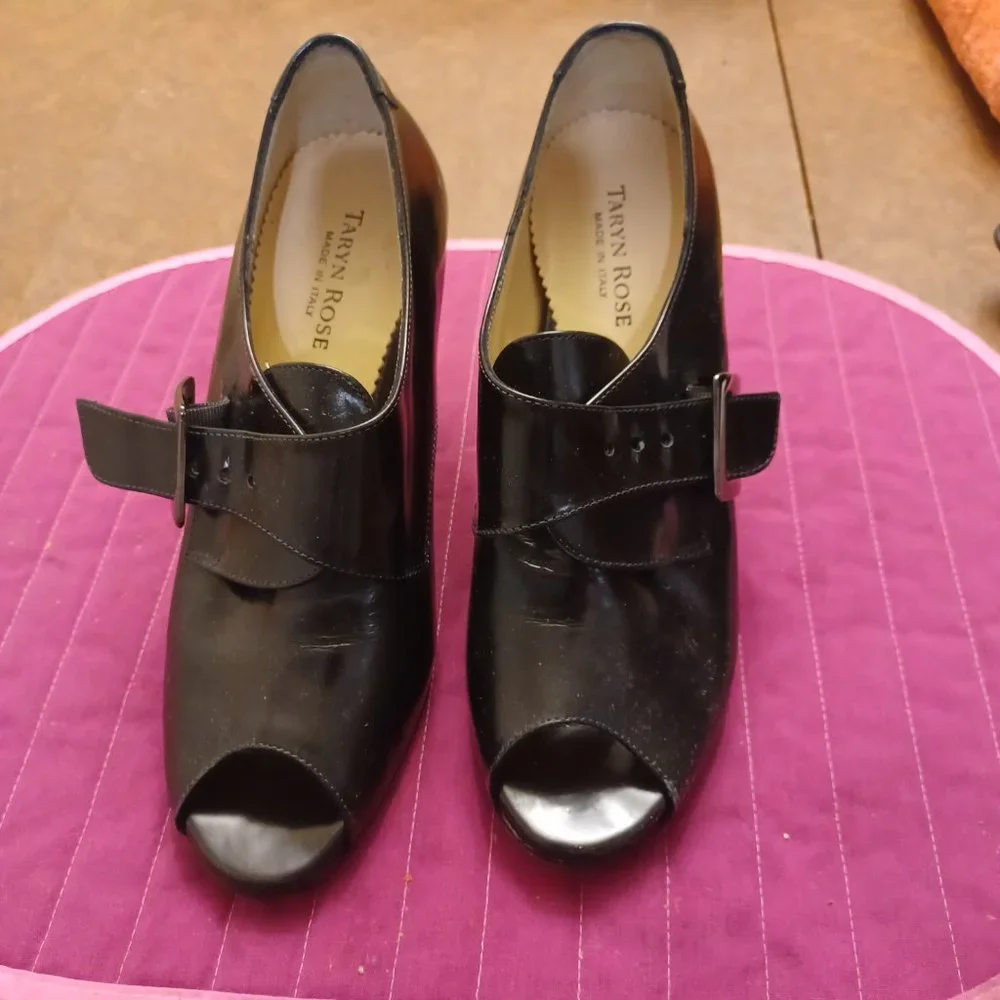 Taryn Rose, size 39 (9), made in Italy, black leather and leather line buckle open toe 4" high heel.