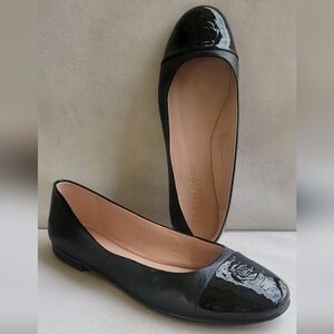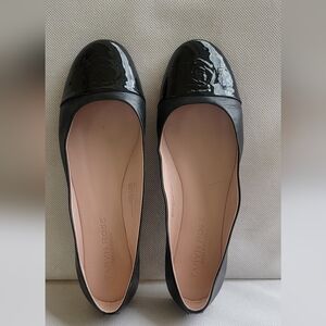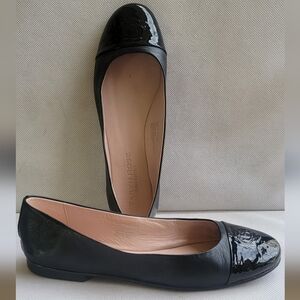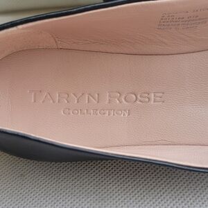 Taryn Rose Adrianna black leather flats (sz 8.5). The flats are in excellent condition. They are clean and ready to wear. The body of the shoe is leather and the toe of the shoe is patent leather. There is a raised rose on the toe of the shoes. Please see all pictures.