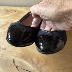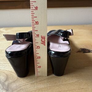 Size 9M, black, patent leather trim and toe cap, adjust back strap, slingback, Poron cushioned footbed, Structured arch support, leather/rubber outsole, 2/5 wedge heel.