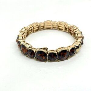 Absolutely stunning TASHA RHINESTONE STATEMENT BRACELET AMBER ORANGE COGNAC BROWN MAGNETIC CLOSURE GOLD TONE. Gorgeous deep amber orange, rich cognac brown colored large faceted rhinestones set in antiqued gold tone metal setting. Signed Tasha on the jewelry tag. Magnetic closure. Measures approximately 7.5" circumference, 2.5" diameter, .5" wide. Great condition.