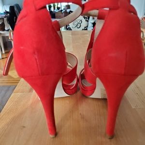 Strappy Red Micro suede, open tasseled heels. PERFECT condition, can be worn formal and casual.