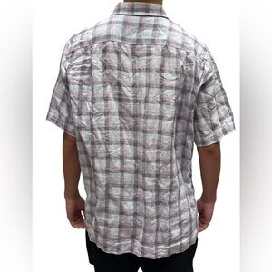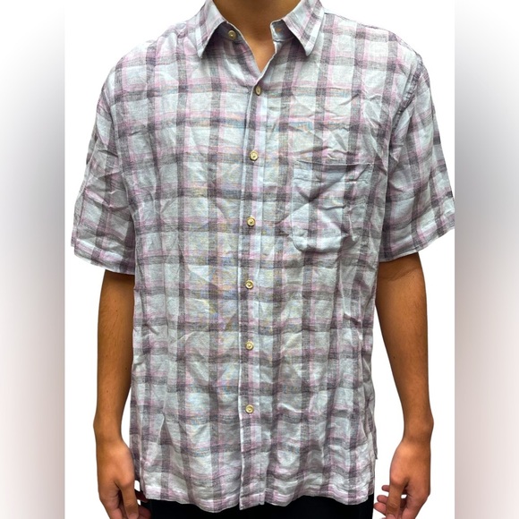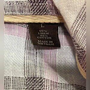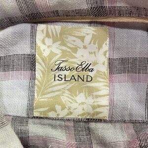 🔥🌴TASSO ELBA Island linen blend shirt Size L. Grayish background w/ plum/pink