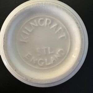 "Tate Gallery by Tube" souvenir ceramic mug with both sides featuring a stylized design of a London Underground public transit system (The Tube) map based on David Booth's iconic poster commissioned in 1986 as part of the Art On The Underground series. Booth's witty map adaptation presents Underground lines in paint, creating a clever play on the word 'tube'. Black text reads, THE TATE GALLERY by Tube. Measures 3.75” tall with a 3.25” diameter; 5” across including handle. Holds 10 fluid oz. Underside features embossed lettering that reads, KILNCRAFT STL ENGLAND