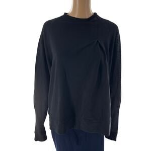 The Tate Jones Cape Sweatshirt in black is made from the most beautiful French Terry with a meticulous attention to detail. This functional yet cool sweatshirt is extremely useful with underarm openings that allow it to be worn in multiple ways. Can be worn with the sleeves on, made into a short sleeve sweatshirt and worn as a cape, or the sleeves can be tied in the front or back. Self banded cuffs and hem. Pleat detail at neckline and cuff. Tonal stitching. Embroidered logo I.D. on left wrist. Proudly made in the USA. Cotton, modal, spandex. Machine wash. In preowned condition, does have some staining under one arm and on one cuff.