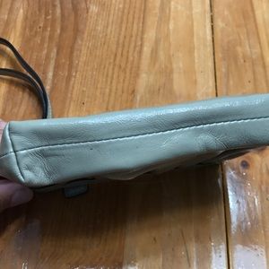Patent leather Coach wristlet in taupe with dark green interior. Great shape (see last pic for tiny blemish on bottom). Approx. 7x4.5”. Have matching bag also listed.