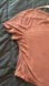 The color is a mauve-y pink color. It is a cute color. Slightly cropped and short sleeve. I wore this once. There are slight sweat stains on the shirt. Please look at all pictures for the condition of the item :)