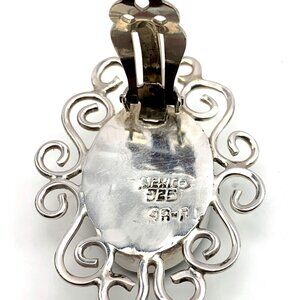 TAXCO Mexico 925 sterling and Onyx ? filigree CLIP on earrings. We have not tested the stones, but believe them to be Onyx. The backs of both earrings are marked with their number and Mexico 925, and are obviously hand made because of small differences in the filigree, etc. which only adds to their character. These very pretty sterling earrings are approximately 1.25"W x 1.5"H in size. Earrings are pre-owned, but in nice condition.
