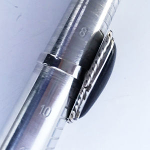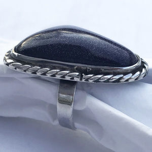 TAXCO Mexico Modernist Triangle Braided Purple Goldstone & Sterling Silver Ring. Hand-crafted size 8.75”- 9 ring; the face = 1.275” h x .625” w, band = .1375” w. Vintage Taxco piece with a glass cabochon made to simulate the gemstone “Goldstone” only this is a darker purple sparkle art glass that reflects purple, silver & copper hues. Amazing to look at! Nice gauge sterling; purchased as vintage sterling silver & worn a few times. Appears to not have been worn very much; excellent used condition