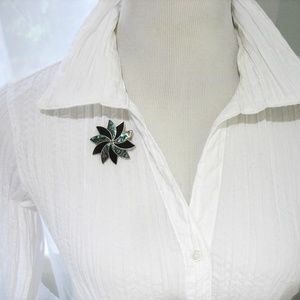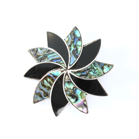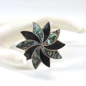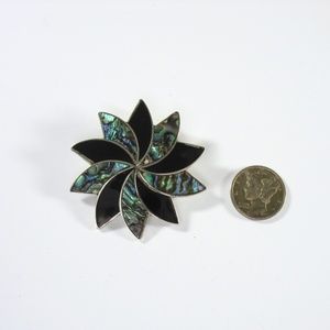 The brooch is a star or flower shape. Petals alternate with inlaid black onyx and abalone shell, c.1950’s-60’s. It’s 1 3/4” x 1 3/4” and is marked Sterling Taxco and Mexico. It also has the Eagle mark with a 3 in the center, which signifies Taxco.