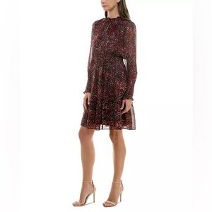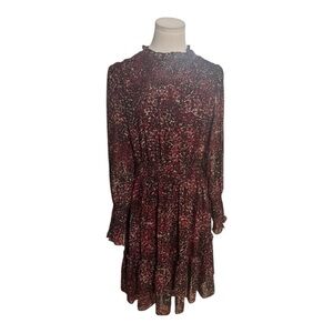 TAYLOR Black Maroon Print Long Sleeve Chiffon Smocked Waist Mini Dress Size 8