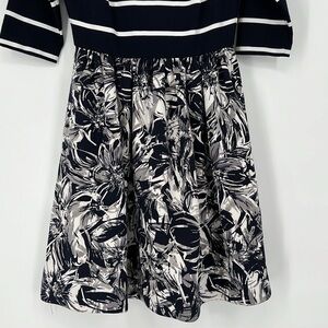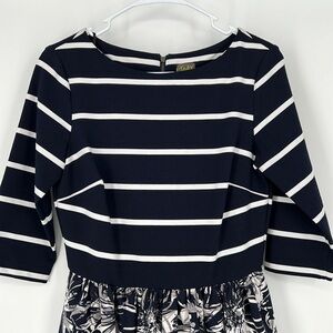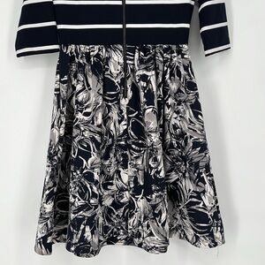 TAYLOR DRESS Size 6 new without tags navy blue and white stripe top, fit and flare floral skirt in navy blue white and grey, zippers down back, three-quarter sleeves very pretty
