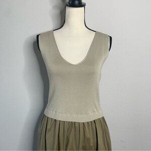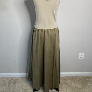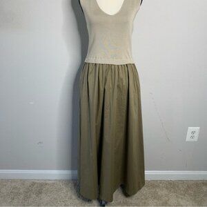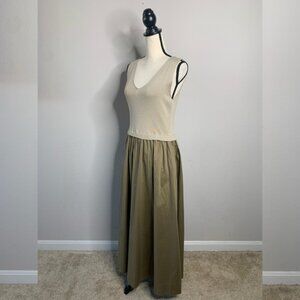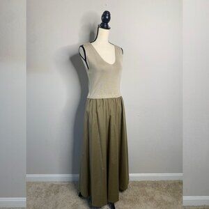 The Taylor Poplin Midi Dress in olive green/grey is a sophisticated and effortlessly chic piece, designed with a flattering A-line silhouette that gracefully skims the body and falls to a midi length, creating a timeless and versatile look. It features a fitted bodice that gently defines the waist, flowing seamlessly into a slightly flared skirt for a balanced, elegant shape. Its classic crew neckline and sleeveless design make it perfect for layering with jackets or cardigans or wearing on its own for a polished, minimalist style. Functional side pockets add a practical yet relaxed touch, blending utility with elegance.