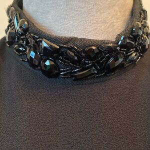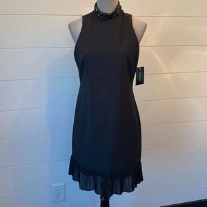 This elegant black sleeveless dress is perfect for any occasion. Its classic design and pleated hem add a touch of sophistication. A must-have for your wardrobe. Rhinestone Mock Neck Light Stretch Crepe Chiffon Ruffle Hem