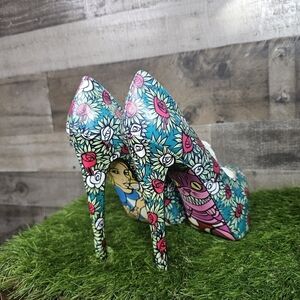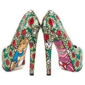 Slip into your own utopia with the Wonderland. Red and white roses are printed on the glossy patent leather upper including a covered 1 inch platform and 6 inch stiletto heel. Presented on the sole is a quirky Cheshire cat and a tattooed up Alice.