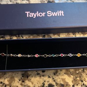 Gold bracelet with adjustable clasp closure and "TS" engraved on charm, featuring 12 gemstones, each representing a Taylor Swift album.