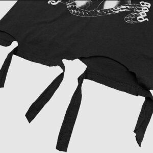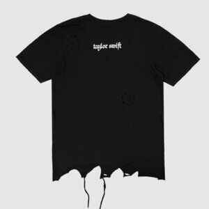 Black distressed t-shirt featuring photo of Taylor Swift with snake and star design and the words “They Say I Did Something Bad, But Why’s It Feel So Good” printed on front and “Taylor Swift” printed on back.