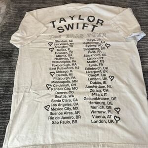 This design is homemade vintage inspired. It is intentionally distressed and flawed. Yes, that collar is meant to be that way. This Taylor Swift T-Shirt is a must-have for any true fan! With a design inspired by The Eras Tour photo of her in enchanted dress this official merchandise features an hearts and has places on the back. The shirt is made to be oversized size L, it's perfect for fans who want to rock some Taylor Swift style.